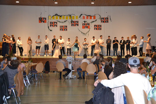 Das bunte Programm an diesem Nachmittag reichte von unterschiedlichen Tanzeinlagen, einem Spiel in dem die Lehrer gegeneinander antreten mussten, verschiedenen Dankesreden bis hin zu musikalischen Beiträgen. Die Klassenlehrer Martin Kemmler und Marco Weber sprachen jeden Schüler in ihrer Rede und einer dazu vorbereiteten Präsentation nochmals persönlich an und blickten auf die Schulzeit an der Kirbachschule zurück.