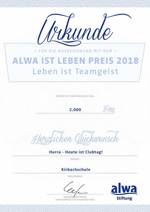 „Leben ist Teamgeist“ – das Motto des diesjährigen „alwa ist leben“-Preises wird in Ihrem eingereichten Projekt auf beeindruckende Weise umgesetzt. Wir freuen uns daher, Ihnen mitteilen zu dürfen, dass Ihr Projekt mit dem „alwa ist leben“-Preis 2018 ausgezeichnet wurde. Herzlichen Glückwunsch!