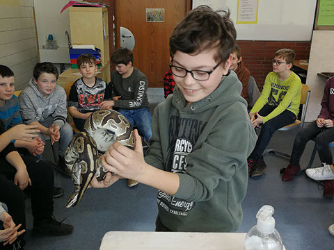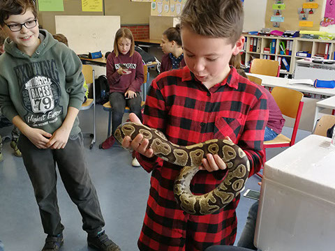 Am 16.3. wurde die Klasse 5 im Rahmen des BNT-Unterrichts von Herrn Graf besucht. Er züchtet in seiner Freizeit Schlangen und freute sich, drei Königspythons mitzubringen und zu zeigen. Er klärte die Klasse über die Lebensweise und Gewohnheiten der Tiere auf. Besonders mutige Schülerinnen und Schüler durften eine der Schlangen sogar halten.