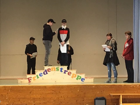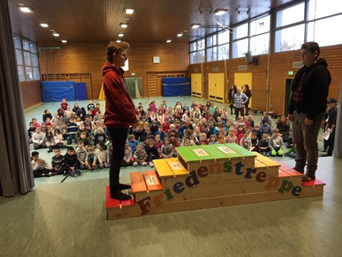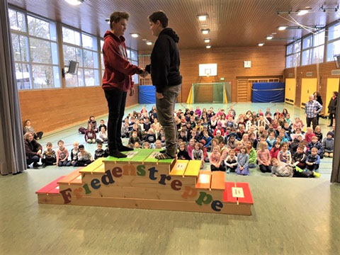 Um zukünftig noch effektiver arbeiten zu können, haben die Streitschlichter zusammen mit der Schulsozialarbeit im Oktober 2018 eine „Friedenstreppe“ gebaut. Sie ist vor allem für jüngere Kinder geeignet, für die das komplexe System der Mediation noch zu schwierig ist.