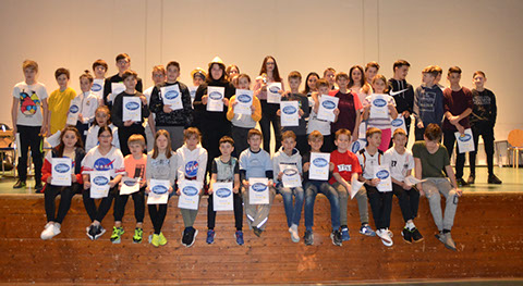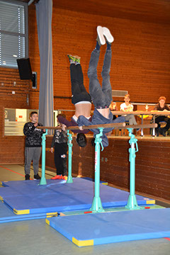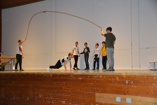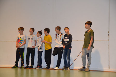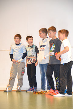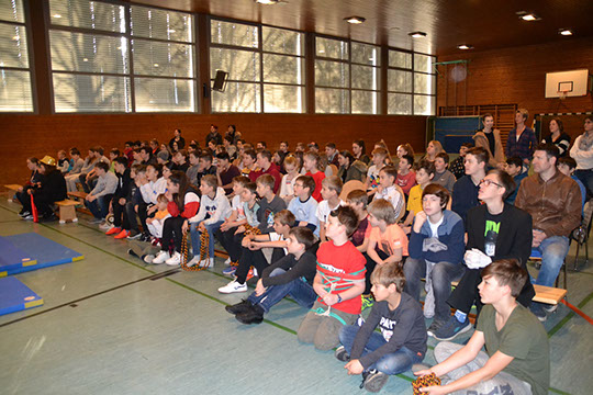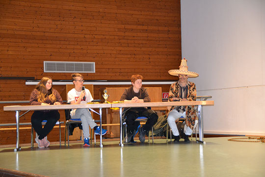 Unter der Moderation von Giuliana Russo und Beyza Aslanoglu startete die Talentshow. Eine unparteiische Jury bewerteten alle vorgetragenen Auftritte. Es begann die Klasse 5 mit einer gelungenen Tanzdarbietung. Erneut ein Teil der 5. Klasse zeigte eine einstudierte Choreographie mit dem Seil. Gefolgt wurde diese Aufführung von zwei Sechstklässlern, die mit Trompete und Horn zu glänzen wussten. Wieder eine Schülerin der 5. Klasse zeigte, wie gut sie Seilspringen kann. Dann kam der Auftritt von zwei Schülern der 7. Klasse, die den Song „Fantastic Baby“ zum Besten gaben, bevor noch einmal die Kunst mit dem Seil von Fünftklässlern dargeboten wurde. Vier „Sechser“ zeigten im Anschluss spektakuläre Kunststücke am Barren. Als Karaokesängerin stand danach eine Siebtklässlerin auf der Bühne. Fasziniert hat anschließend wieder ein „Siebener“, der zeigte, was man für Tricks mit einem Fußball machen kann. Perfekt performed war eine Kür zweier Siebtklässlerinnen mit dem Band, bevor erneut eine Seilspringgruppe ihren Auftritt zeigte. Nach den zahlreichen Darbietungen kam ein Solosong einer Zehntklässlerin. Die Zuschauer waren begeistert. Bei dem perfekt gesungenen Song bekam man Gänsehaut. Und so wurde diese Nummer auch zurecht zum Superstar gekührt. Den Schlusspunkt des Programms bildete die Nummer eines Entfesslungskünstler aus Klasse 5. Den zweiten Platz ergatterten die zwei Siebtklässler mit Horn und Trompete. Platz 3 ging an die Barrenturner.