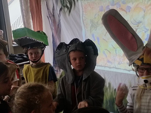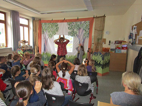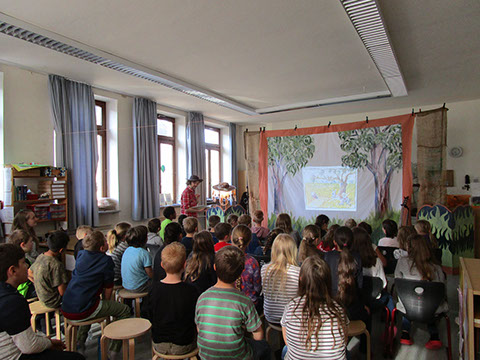 Am Dienstag hatten die 3. und 4. Klassen das Glück einer interaktiven Lesung von Dominic Hogan beizuwohnen. Als gebürtiger Australier las und spielte er sein Buch „Im Tal des Lavendels“ abwechselnd auf Deutsch und Englisch vor. Alle Zuhörer waren aktiv dabei und übernahmen erst gemeinsam, dann auch alleine kleine Rollen ein. Wir entdeckten das ein oder andere Theaterspiel-Talent und hatten riesen Spaß!