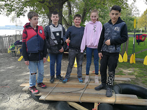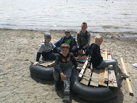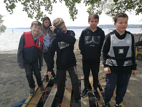 Am Dienstag hatte uns Frau Kernberger, die uns in den ersten beiden Tagen begleitete, ein erlebnispädagogisches Programm gebucht. Zuerst mussten die Schüler einige knifflige Aufgaben durch gute Zusammenarbeit lösen. Danach bauten sie in Gruppen Flöße. Leider war das Wasser zu kalt um sie mit Besatzung im See zu testen. Eines der Boote, das den „TÜV“ bestanden hatte, wurde deshalb am Kajak angebunden auf den See gezogen.