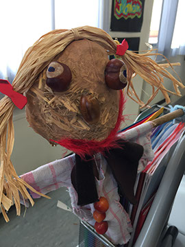 Der Kopf wurde im nächsten Schritt mit Woll-Haaren, Perlen, Korken, Federn, Eicheln und Bucheckern o.ä. als Augen, Nase, Haare, Ohren oder Mund beklebt.
